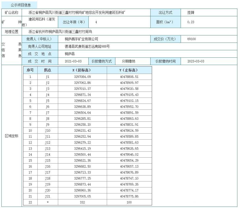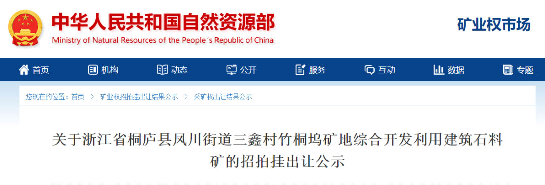 浙江省桐廬縣鳳川街道三鑫村竹桐塢礦地綜合開發利用建筑石料礦采礦權出讓成交結果公示