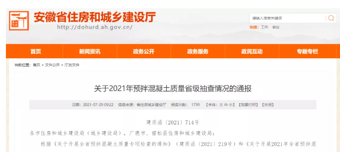 近日,安徽省住房城鄉建設廳發布了《關于2021年預拌混凝土質量省級抽查情況的通報》,表示抽查亳州市、蚌埠市、阜陽市、淮南市、銅陵市、池州市6個省轄市,共計30個在建工程(市本級抽查3項工程,所轄縣抽查2項工程),其中住宅工程19個,公共建筑工程11個。從整體情況來看,大多數工程參建主體能夠嚴格執行混凝土質量相關法律法規和工程建設強制性標準;受檢工程預拌混凝土質量總體可控。