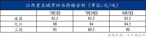 7月份江西地區砂石市場情緒總體不高,下游需求一般,截止8月5號,南昌地區砂石價格穩定,暫無波動,主要原因是南昌地區砂石主要供本地市場應用,不對外發售,砂石價格波動較小。九江地區砂石均價94.5元/噸,月環比下跌3.7%,周環比上漲0.53%。上饒砂石均價90元/噸,月環比下跌1.11%,周環比上漲0.78%。總體來看,江西地區砂石跌勢收窄,并在月末出現推漲姿態。