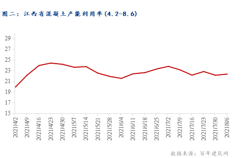 7月份由于受到高溫多雨天氣加上臺風“煙花”的影響,市場成交量低迷,下游需求遭受到了一定的沖擊,砂石出貨量下滑,砂石價格支撐力不足。7月底水泥市場月末開始第一輪漲價,混凝土出貨量略有提升,華東部分地區施工進度加快,混凝土市場需求大幅增加,江西省截止8月6號混凝土平均產能利用率為22.31%,月環比下降6.07%,周環比小幅增長1%。建材市場逐漸回暖,我們預計砂石需求量將逐漸恢復,隨著旺季到來,砂石價格回暖信心漸濃。