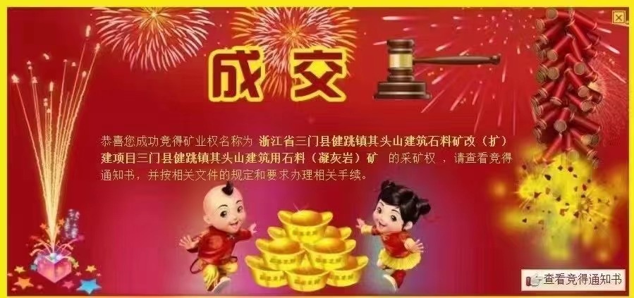 成功競得礦業權名稱為:浙江省三門縣健跳鎮其頭山建筑石料礦改(擴)建項目三門縣健跳鎮其頭山建筑石料礦(凝灰巖)礦的采礦權