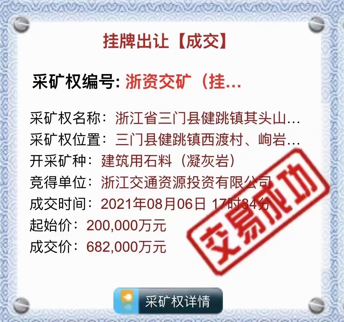 68.2億元!浙江交投競得新砂石礦權,創國內砂石礦山類出讓新紀錄