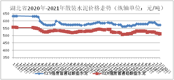 礦渣硅酸鹽水泥、52.5強度普通硅酸鹽水泥,湖北省平均價格分別為:518.55元/噸、541.95元/噸、581.49元/噸,與6月相比,價格分別下跌1.46%、0.85%和0.59%;同比變化情況為-2.25%、0.32%、0.23%。具體價格走勢情況如下圖: