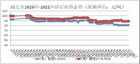 7月份,湖北省大部分地區受降水及高溫影響,市場總體對建筑原料需求較弱,價格下行。