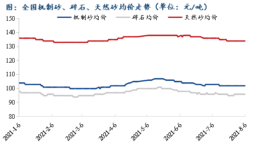 概述:據統計,截至8月6日,全國綜合砂石價格110.67元/噸,與上周持平,同比增長2.7%;全國天然砂均價134元/噸,與上周持平;機制砂均價102元/噸,與上周持平;碎石均價96元/噸,與上周持平。