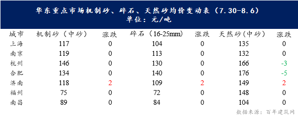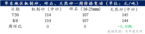 本周,全國及華東砂石需求增長不明顯,據百年建筑網統計,截至8月6日,本周華東市場砂石均價高于全國砂石均價11.24元/噸,機制砂價格高于全國12元/噸,碎石價格高于全國11元/噸,天然砂價格均高于全國均價10元/噸,較上周天然砂價差收窄,機制砂和碎石價差暫無變化。