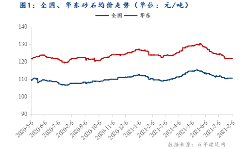 據統計,截至8月6日,本周全國綜合砂石價格111元/噸,本周價格暫無波動;華東地區砂石均價121.90元/噸,周環比下跌0.08%。下游施工及混凝土市場本周延續疲弱態勢,終端市場對砂石需求暫未好轉。據悉華東大部分市場受高溫雨水天氣影響,項目工地工程進度放緩,砂石供應暫緩,因此華東砂石環比小幅下跌,但跌幅收窄。預計短期內跌勢難改,行情穩中偏弱。