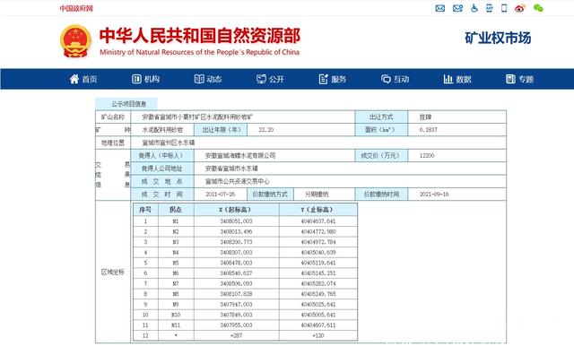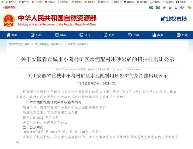 日前,自然資源部發布一則采礦權出讓結果公示,安徽宣城海螺水泥有限公司7月26日以1.22億元成交價中標安徽省宣城市小葛村礦區水泥配料用砂巖礦采礦權。詳情如下: