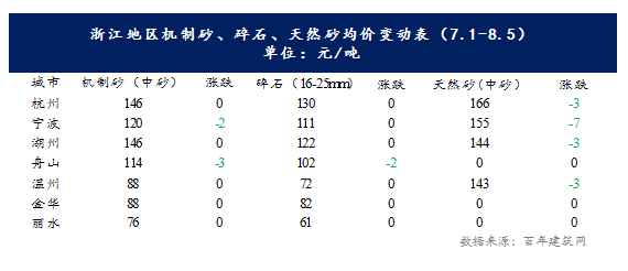 溫州:7月20號主流品牌機制砂價格下跌5元/噸,8月3號天然砂價格再次下跌3元/噸。