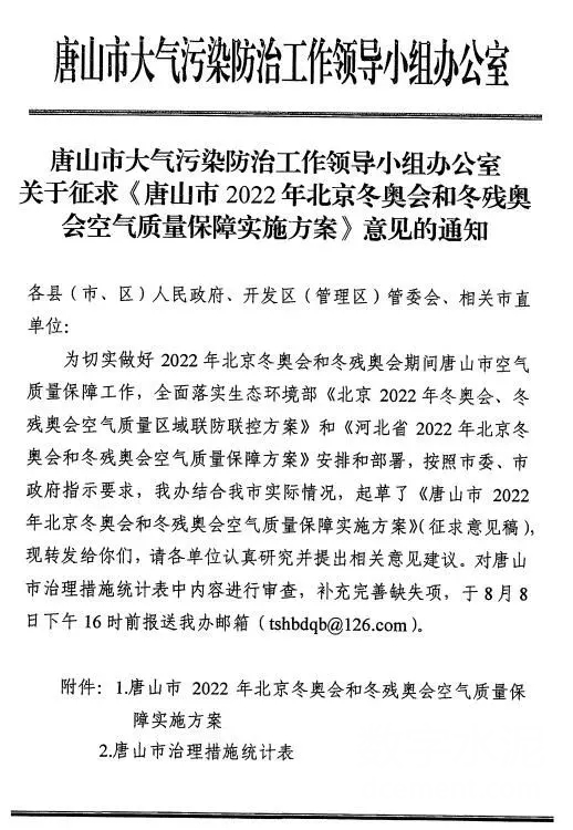 為切實做好2022年北京冬奧會和冬殘奧會(以下簡稱冬奧 會)期間唐山市空氣質(zhì)量保障工作,全面落實生態(tài)環(huán)境部《北京 2022年冬奧會、冬殘奧會空氣質(zhì)量區(qū)域聯(lián)防聯(lián)控方案》和《河 北省2022年北京冬奧會和冬殘奧會空氣質(zhì)量保障方案》安排和部署,結(jié)合唐山實際,特制定本方案。