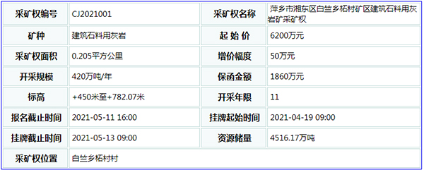 據砂石數據中心了解,近年來,江西九江的砂石類采礦權拍賣過程十分激烈,有些掛牌出讓的采礦權在競拍過程中出現了惡意抬價、競得后又放棄的現象,最終造成采礦權出讓失敗。其中,江西省德安縣豐林白云嶺礦區建筑石料用灰巖礦采礦權共掛牌出讓四次,前三次出讓均已失敗告終,第四次江西省德安縣自然資源局將該礦以起始價150000萬元掛牌出讓,最終在2020年11月23日由德安縣南方新材料有限公司以150100萬元成功拍下。該采礦權面積0.7771平方公里,可采礦石量16740萬噸,開采規模600萬噸/年,開采年限27.9年。