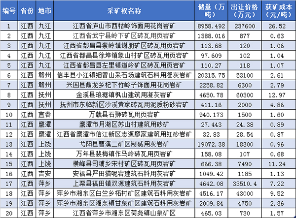 據砂石數據中心的不完全統計,自2021年1月1日至2021年7月31日,江西省掛牌出讓砂石類采礦權共20宗,總涉及批復儲量約71884.4萬噸,已成交采礦權的出讓總金額為471142.32萬元,平均獲礦成本約為4.58元/噸。
