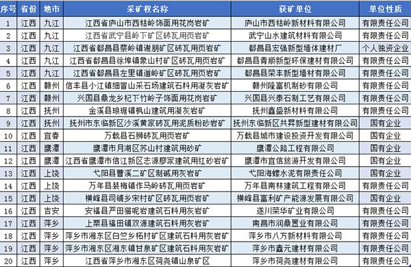 表1 江西省1-7月砂石類采礦權獲礦單位