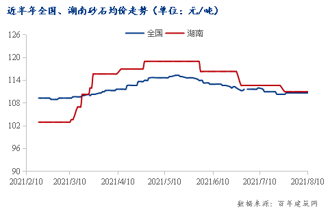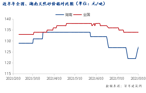 據百年建筑網統計,截至2021年8月10日,全國砂石均價111.83元/噸,湖南砂石均價113.33元/噸,高出全國砂石價格1.5元/噸,三月到五月中旬,湖南地區天然砂礦區及砂石料礦場生產節奏加快,下游企業也陸續復工,砂石需求量有所回升,價格有所上漲,五月下旬到八月,受環保督察的影響,多個