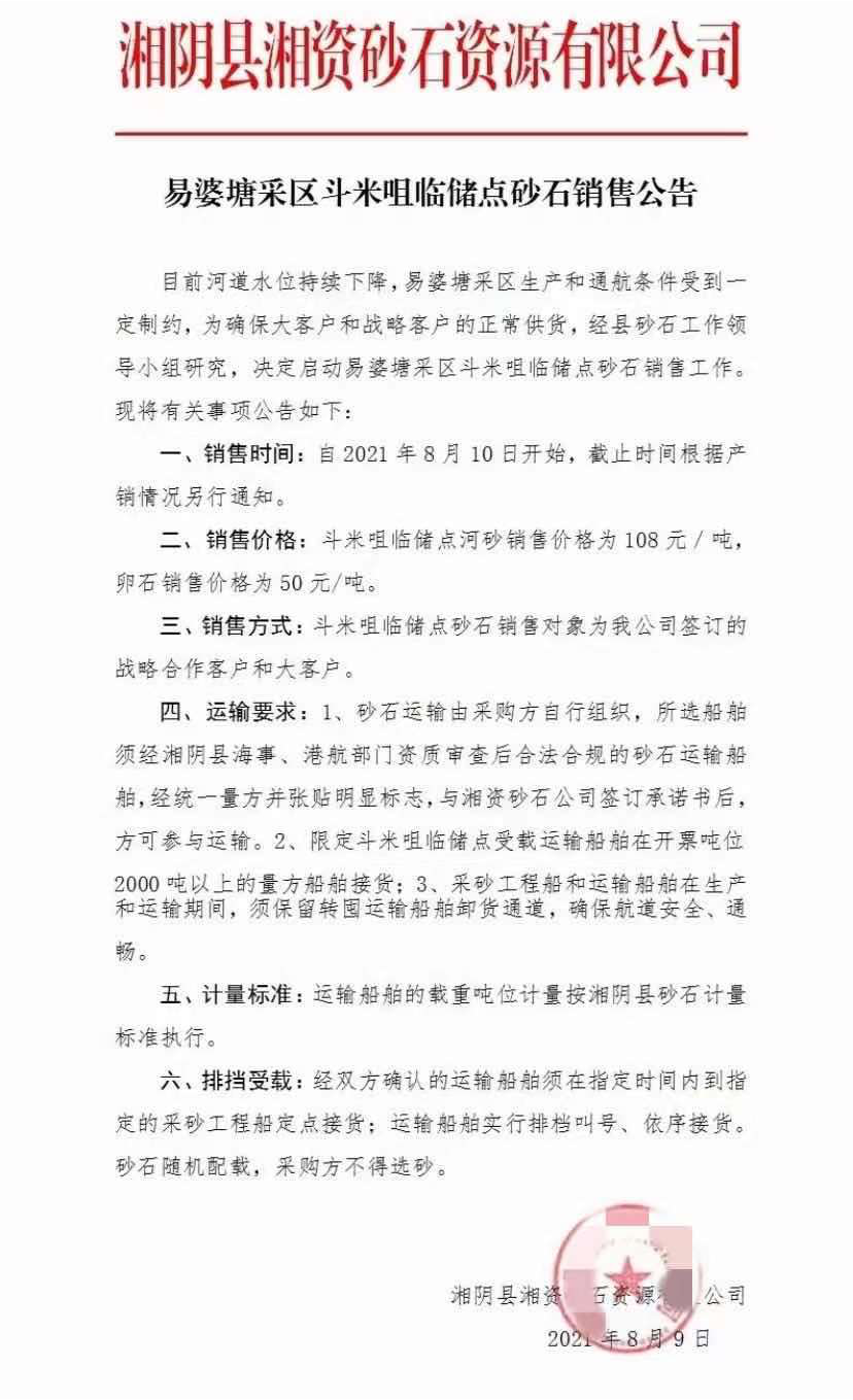 據報道,湖南省湘陰縣湘資砂石資源有限公司自8月10日起,易婆塘采區河道砂石銷售價格統一調整為河砂108元/噸、卵石50元/噸。據市場反饋,本次漲價的原因是由于水位下降,洞庭湖迎來枯水季節,廠家為擴大砂石供應、平抑砂石價格進而進行了價格的調整。