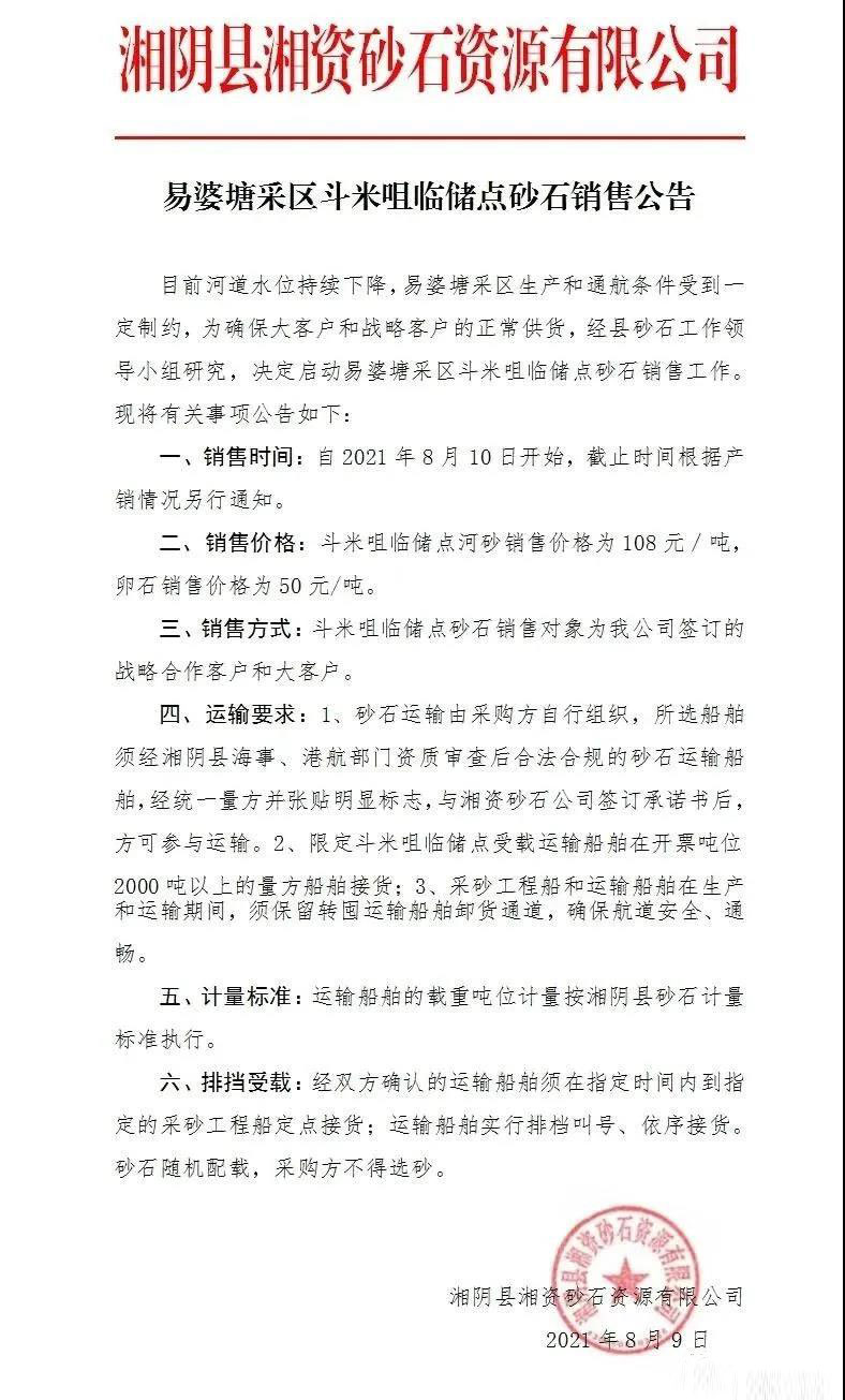 據悉,湘陰縣湘資砂石資源有限公司發布易婆塘采區斗米咀臨儲點砂石銷售公告。因目前河道水位持續下降,易婆塘采區生產和通航條件受到一定制約,為確保大客戶和戰略客戶的正常供貨,經縣砂石工作領導小組研究,決定啟動易婆塘采區斗米咀臨儲點砂石銷售工作。
