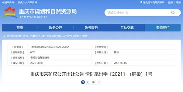 該采礦權的公告時間為2021年8月5日12時-2021年9月1日12時。公告時間內只有1家單位申報的將采取掛牌出讓;公告時間內有2家以上(含2家)申報的采取拍賣方式確定受讓方,拍賣時間為2021年9月2日10時(如有特殊情況,則另行通知)。