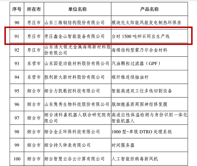 捷報傳來!近日,山東省工業和信息化廳公布了關于《2021年山東創新工業產品目錄》名單,棗莊鑫金山智能裝備有限公司“臺時1500噸砂石同出生產線”成功入選。