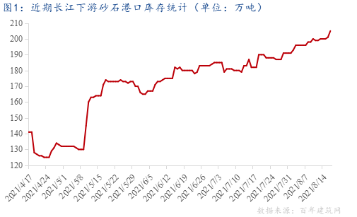 據調研數據顯示,長江下游砂石港口庫存自二季度中旬開始,持續增長,截止8月18日,港口庫存量周度環比增長3%,月環比增長13%,較二季度旺季最低庫存相比,增幅超6成。因此可以看出下游港口砂石庫存本周高位運行,因此下游市場恢復到旺季水平仍需一段時間。