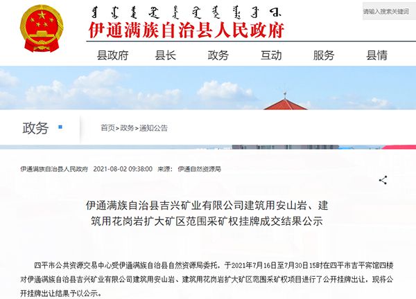 日前,伊通滿族自治縣吉興礦業有限公司建筑用安山巖、建筑用花崗巖擴大礦區范圍采礦權出讓成功。