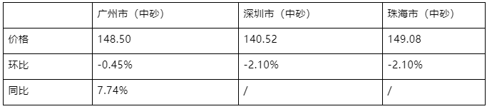 7月份,中砂:珠海市(價格為:149.08元/噸),廣州市(價格為:148.50元/噸),深圳市(價格為:140.52元/噸);環比上個月,深圳市(跌幅為-2.10%),珠海市(跌幅為-2.10%),廣州市(跌幅為-0.45%),跌幅較大;同比去年同期,廣州市(漲幅為7.74%),價格漲幅較高。