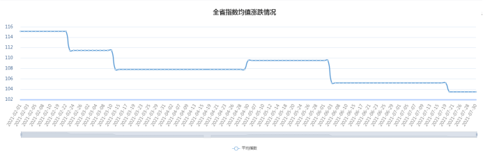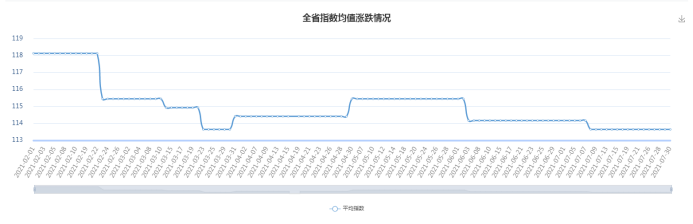 7月份,廣東省中砂:最高指數114.17(2021年07月07日,環比0.00%,同比6.43%),最低指數113.65(2021年07月08日,環比-0.46%,同比5.95%),見下圖