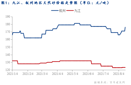 采砂貿易競爭激烈。根據市場反饋從砂口已經拿不到鄱陽湖湖砂了,只能從貿易商手上購入,貿易商又進行加價售出,價格一直在攀升。其中浙江地區整體市場需求較大,本地天然砂又供應有限,需省外鄱陽湖、福建等砂石做補充。而近期鄱陽湖湖砂開采量受限,加上水位偏低,供應收窄。原料價格本身就高再加上運費上漲,整體成本一再加高,故杭州市場天然砂價格逐漸升高,8月13-17號杭州天然砂價格上漲10-15元/噸,現目前主流湖砂價格在175-190元/噸。