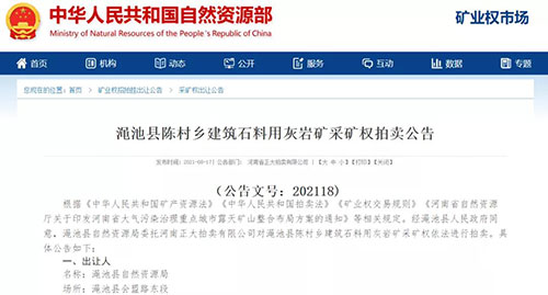 日前,《澠池縣陳村鄉建筑石料用灰巖采礦權拍賣公告》發布,河南省三門峽市澠池縣自然資源局擬對澠池縣陳村鄉建筑石料用灰巖礦采礦權依法進行拍賣。