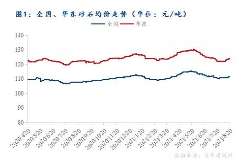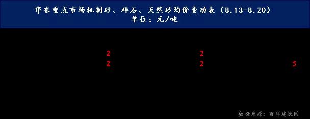 據統計,截至8月20日,本周全國綜合砂石價格111.33元/噸,周環比上漲0.3%;華東地區砂石均價123.95元/噸,周環比上漲0.5%。天然砂近期開采量受限,供應走窄,部分地區價格有所回升。下游施工及混凝土市場本周恢復不及預期,終端市場對砂石需求一般,機制砂和碎石價格仍舊偏弱。預計短期內天然砂價格震蕩上行,碎石、機制砂價格弱勢持穩運行。