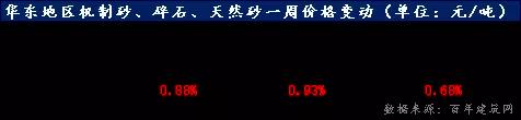 本周,華東地區砂石價格小幅上漲,華東地區機制砂均價為115元/噸,碎石均價108元/噸,天然砂均價149元/噸,華東砂石周環比分別上漲0.88%、10.93%、0.68%。