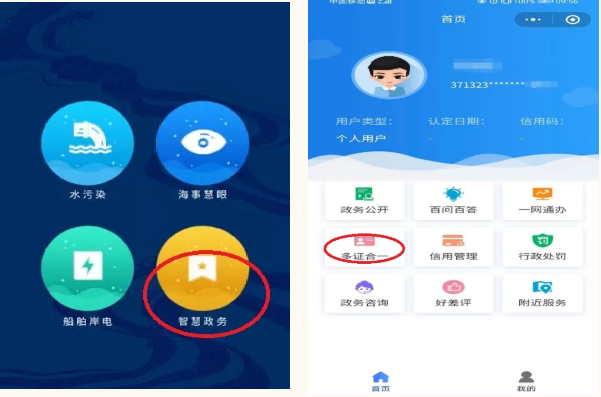 微信搜索并打開“船E行”小程序,進入“智慧政務”模塊申請“多證合一”《證明書》;