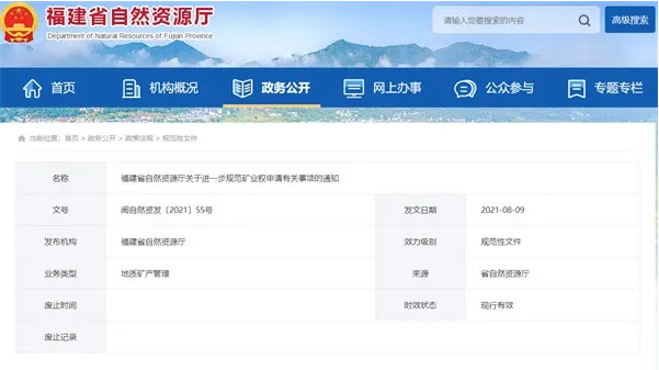 福建省進一步規范礦業權申請 非自身原因無法辦理延續手續的可順延2年