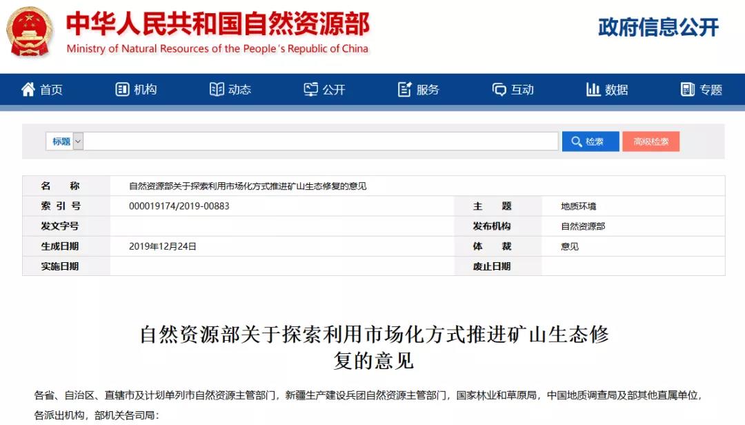 2019年自然資源部公開發布《關于探索利用市場化方式推進礦山生態修復的意見》以下簡稱《意見》),通過自然資源政策激勵,吸引社會各方投入,探索推行市場化運作、科學化治理的礦山生態修復模式。