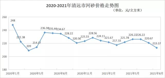 2021年8月份(數據截止2021年8月25日,下同)河砂購進均價為213.17元/m?,環比(與2021年7月價格相比,下同)降3.4%,同比(與2020年8月價格相比,下同)降9.16%。