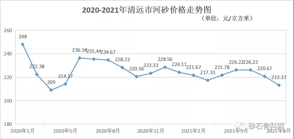 2021年8月份(數據截止2021年8月25日,下同)河砂購進均價為213.17元/M3,環比(與2021年7月價格相比,下同)降3.4%,同比(與2020年8月價格相比,下同)降9.16%。