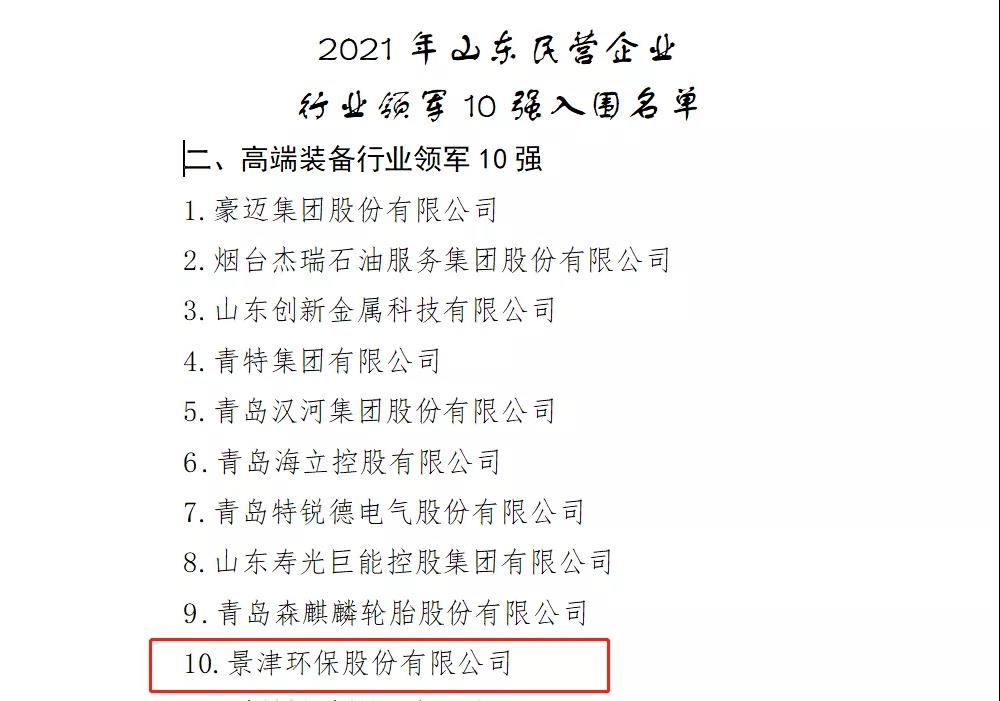 近日,山東省工業和信息化廳公示了《關于對2021年山東民營企業100強、行業領軍10強、創新100強入圍名單公示的公告》,中國砂石協會副會長單位——景津環保股份有限公司(以下簡稱“景津環保”)成功入選2021年山東民營企業行業領軍10強入圍名單。