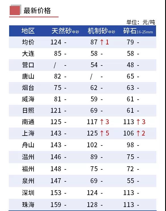 本周沿海城市砂石價格穩中有升,天然砂均價暫穩,機制砂、碎石均價有所上漲。