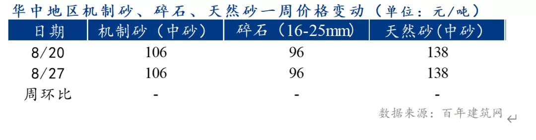 本周,全國及華中砂石價格沒有太大波動,據百年建筑網統計,截至8月27日,本周華中市場砂石均價高于全國砂石均價2元/噸,機制砂價格高于全國均價3元/噸,碎石價格與全國均價持平,天然砂價格高于全國均價3元/噸。較上周相比,華中地區天然砂、碎石和機制砂暫無價差。