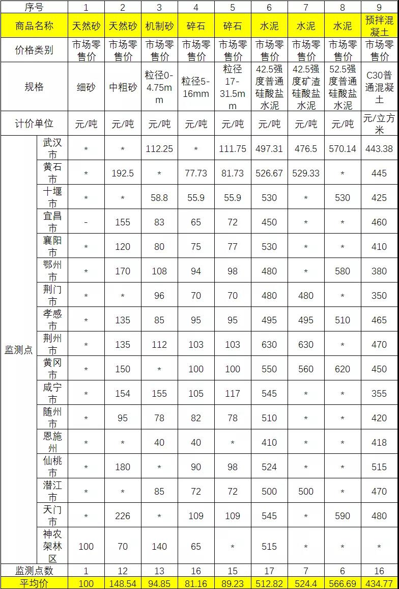 據湖北省發改委最新發布的“2021年8月27日湖北省省建筑用砂石水泥混凝土價格匯總表”,8月27日湖北天然砂細砂均價為100元/噸,天然砂中粗砂為148.54元/噸;機制砂為94.85元/噸;碎石粒徑5-16mm和粒徑17-31.5mm分別為81.16元/噸、89.23元/噸。