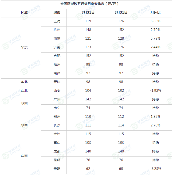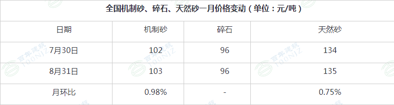 項目開工情況穩中偏強,下旬之后,市場需求有一定起色,加上天然砂開采時間到期,市場供不應求。而9月即將到來,傳統需求旺季開啟,砂石需求還將進一步提高,9月砂石價格持續看好。