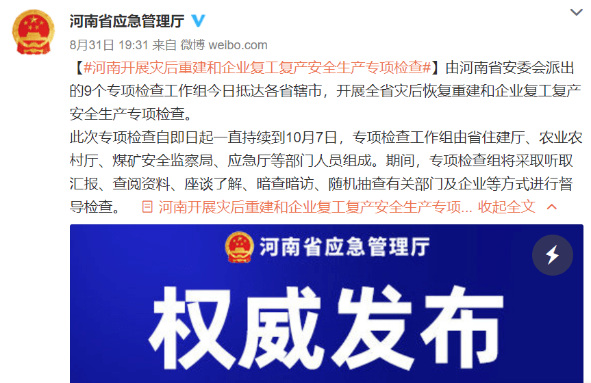 據河南省應急廳消息, 由河南省安委會派出的9個專項檢查工作組抵達各省轄市,開展全省災后恢復重建和企業復工復產安全生產專項檢查。