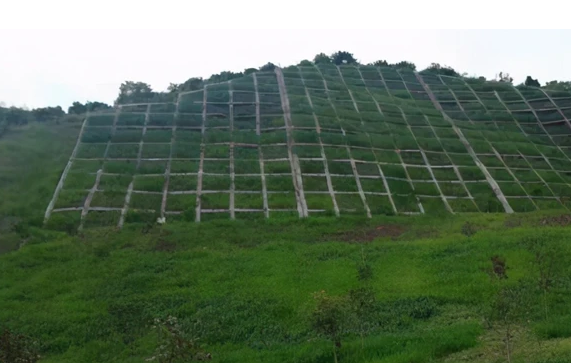 項目區主體邊坡區域采用“格構梁+生態袋護坡+噴播草籽綠化”進行治理,形成生態屏障。