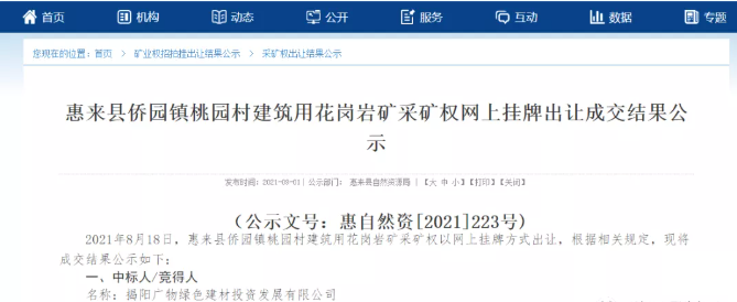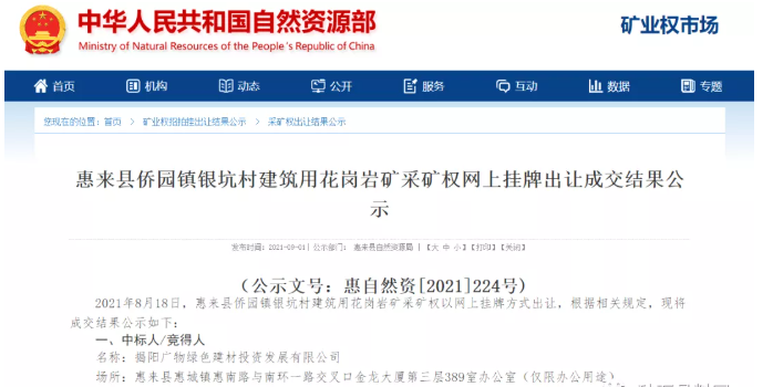 日前,廣東省揭陽市惠來縣僑園鎮桃園村建筑用花崗巖礦與惠來縣僑園鎮銀坑村建筑用花崗巖礦兩宗采礦權在同一日成功出讓,競得人均為揭陽廣物綠色建材投資發展有限公司。