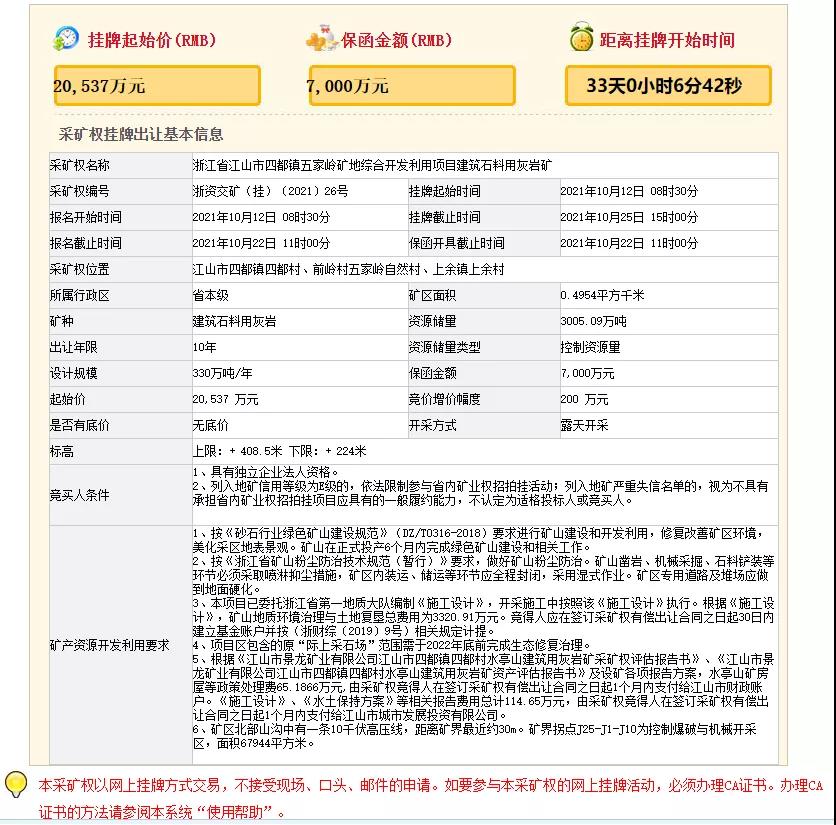 9月8日,浙江省江山市自然資源和規劃局發布江山市四都鎮五家嶺礦地綜合開發利用項目建筑石料用灰巖礦網上掛牌出讓公告。