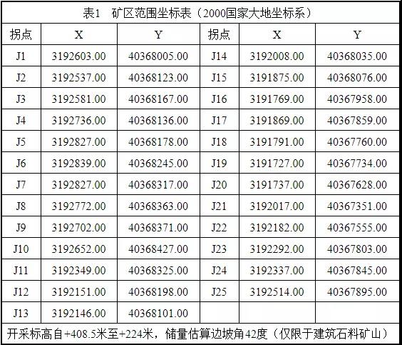4、礦區范圍:由25個拐點圈定,礦區面積約0.4954平方千米,礦區開采標高自+408.5米至+224.0米,礦區范圍坐標見表1。