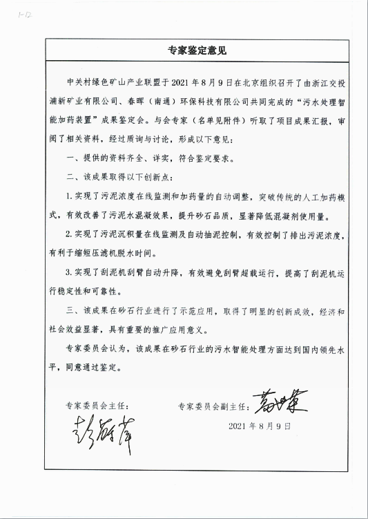 近日,中關村綠色礦山產業聯盟2021年科技成果鑒定會傳來喜訊,浙江交通集團交通資源公司下屬單位——浦新礦業公司完成的“污水處理智能加藥裝置”項目成果,被鑒定為砂石行業污水智能處理工藝國內領先水平。“污水處理智能加藥裝置”項目由西安春暉實業集團助力完成,加工原料為優質的凝灰巖,開采加工規模時產1600噸,該項目是迄今為止浙江省最大的硬巖骨料加工項目之一。