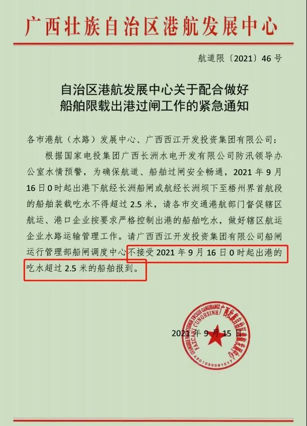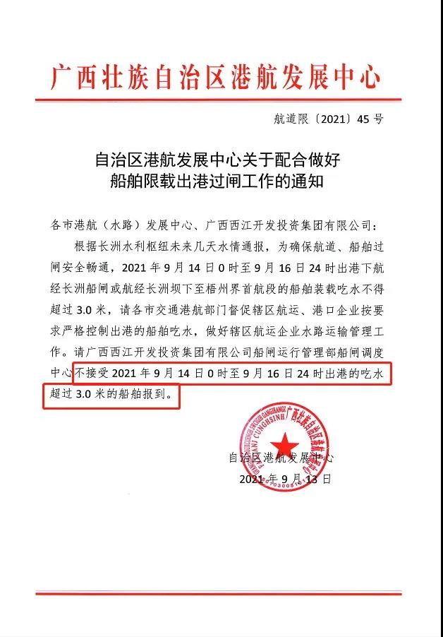 9月15日,廣西壯族自治區港航發展中心發布《自治區港航發展中心關于配合做好船舶限載出港過閘工作的緊急通知》(航道限(2021)46 號)給各市港航(水路)發展中心、廣西西江開發投資集團有限公司稱,根據國家電投集團廣西長洲水電開發有限公司防汛領導辦公室水情預警,為確保航道、船舶過閘安全暢通,2021年 9 月 16 日0時起出港下航經長洲船閘或航經長洲壩下至梧州界首航段的船舶裝載吃水不得超過 2.5 米,請各市交通港航部門督促轄區航運、港口企業按要求嚴格控制出港的船舶吃水,做好轄區航運企業水路運輸管理工作。