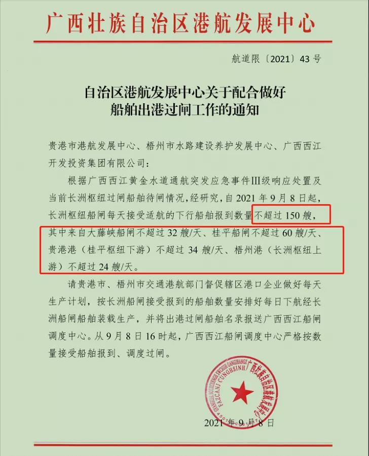 9月8日廣西壯族自治區港航發展中心發《自治區港航發展中心關于配合做好船舶出港過閘工作的通知》(航道限〔2021)43號)給貴港市港航發展中心、梧州市水路建設養護發展中心、廣西西江開發投資集團有限公司稱,根據廣西西江黃金水道通航突發應急事件IⅢI級響應處置及當前長洲樞紐過閘船舶待閘情況,經研究,自2021年9月8日起,長洲樞紐船閘每天接受適航的下行船舶報到數量不超過150 艘,其中來自大藤峽船閘不超過32艘/天、桂平船閘不超過60 艘/天、貴港港(桂平樞紐下游)不超過34艘/天、梧州港(長洲板紐上游)不超過 24 艘/天。