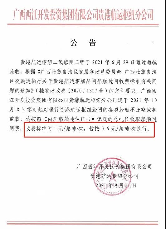 據獲悉,西江航道是廣西砂石輸送廣東方向的重要航道。9月16日,廣西西江開發投資集團有限公司貴港航運樞紐分公司發布船舶過閘收費公告,于2021年10月8日零時起對通行貴港航運樞紐船閘的各類船舶不分空載和重載,均按照《內河船舶噸位證書》記載的總噸位收取船舶過閘費,收費標準為1元/總噸次,暫按0.6元/總噸·次執行。