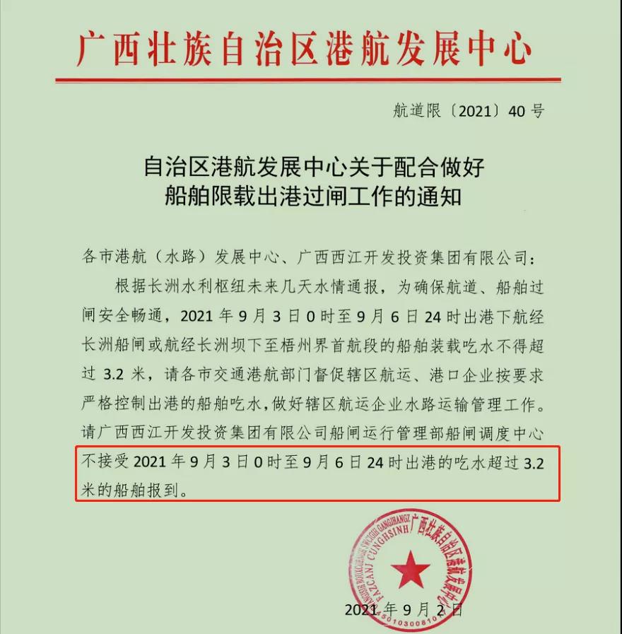 9月15日,廣西壯族自治區港航發展中心發布《自治區港航發展中心關于配合做好船舶限載出港過閘工作的緊急通知》(航道限(2021)40 號)給各市港航(水路)發展中心、廣西西江開發投資集團有限公司稱,,根據長洲水利樞紐未來幾天水情通報,為確保航道、船舶過閘安全暢通,2021年9月3日0時至9月6日24時出港下航經長洲船閘或航經長洲壩下至梧州界首航段的船舶裝載吃水不得超過3.2米,請各市交通港航部門督促轄區航運、港口企業按要求嚴格控制出港的船舶吃水,做好轄區航運企業水路運輸管理工作。